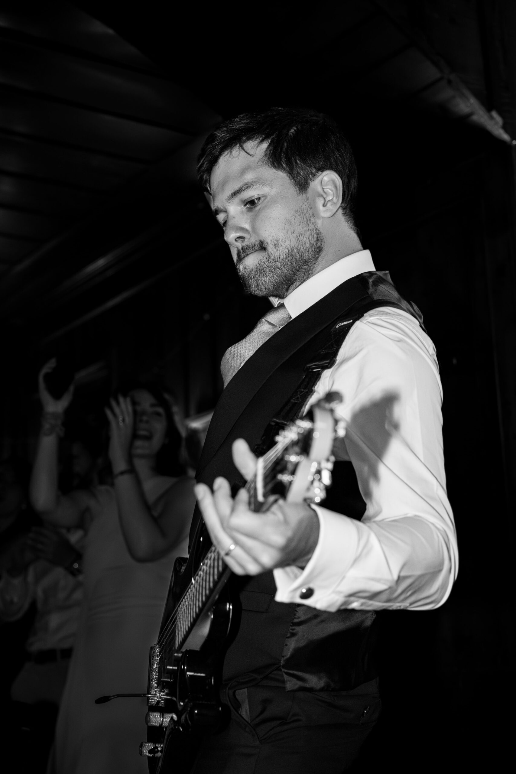 C’est une performance énergique à la guitare par le marié qui a lancé la soirée, avant que le DJ Théo Charroy (Prestevent) ne prenne le relais pour enflammer la piste. L’énergie collective, en altitude, prend une dimension particulière : tout le monde est pleinement présent, déconnecté du quotidien.